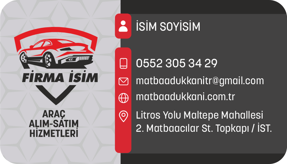 kartvizit genellikle sade, resmi ve güven veren bir görünüme sahip olur. Siyah, lacivert, gri gibi klasik renkler tercih edilir. Oto Galeri  temalı ikonlar (araç alım satım vb.) da sıkça kullanılır.